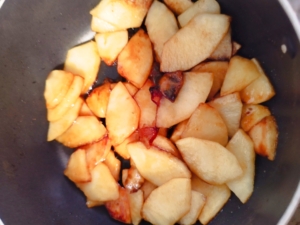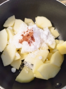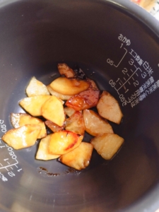 - 炊飯釜の底に3のりんごを半量敷き詰めます。
