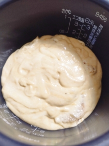 - 炊飯釜にケーキミックスを混ぜたボウルの中身を入れます。この時、ミックスが炊飯釜の半分を超えないように注意してください。
