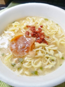 お湯を注いで、ふたを開けると、ふわっと広がる豚骨の香り。