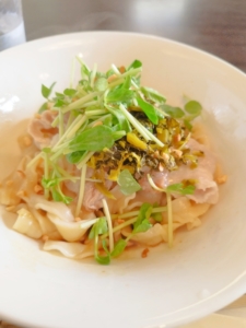 豆苗のさっぱりとした青さ、そして高菜と玉ねぎの、じんわりと奥行きをつくる味わいも加わり、全体としてとても深い味になっています。